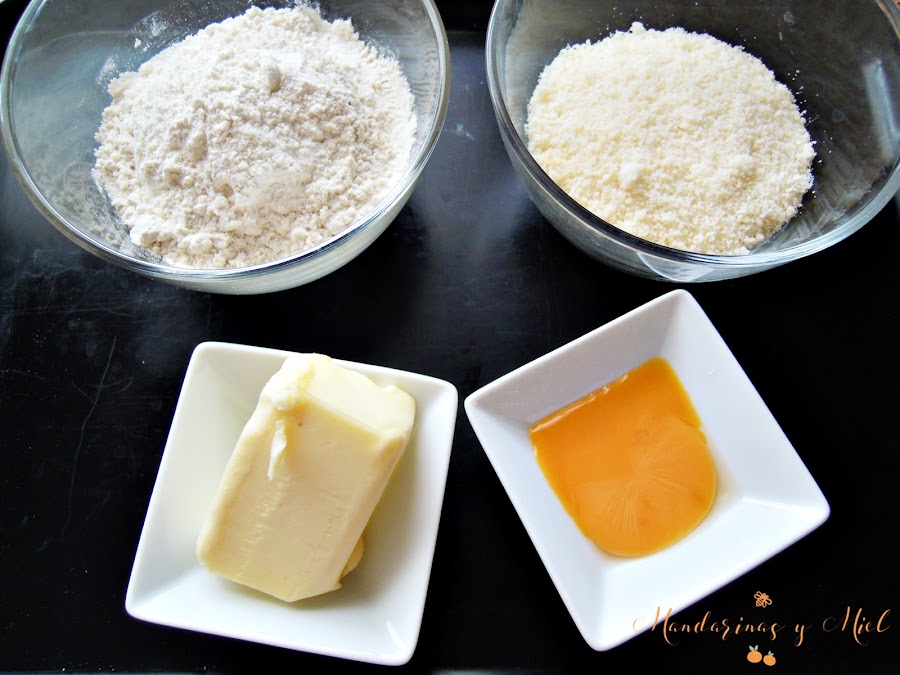 Pon en un bol la harina, el queso, una pizca de sal, la yema y la mantequilla a temperatura ambiente.