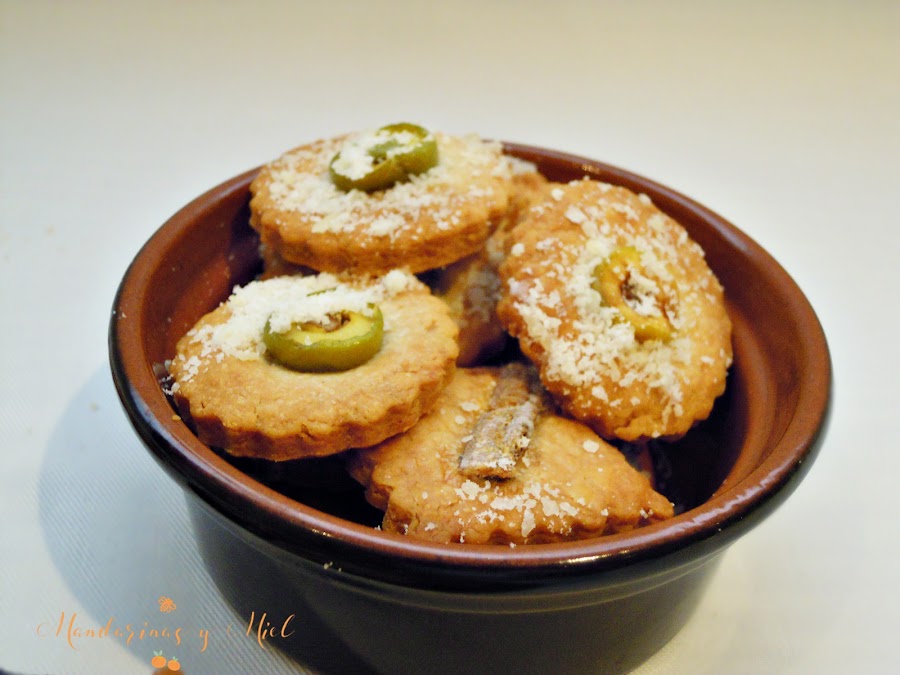 Así que enseguida pensé en hacer estas de queso que suelo preparar de vez en cuando y que nos encantan, las adorné con aceitunas rellenas y con anchoas que le van de categoría al queso!!