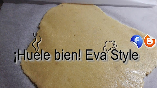 Cortamos dos laminas grande de papel de horno. Extendemos una de ellas sobre la encimera, cortamos la masa en dos porciones, colocamos una porción de la masa sobre el papel. La cubrimos con la otra lamina y extendemos la masa con un rodillo.