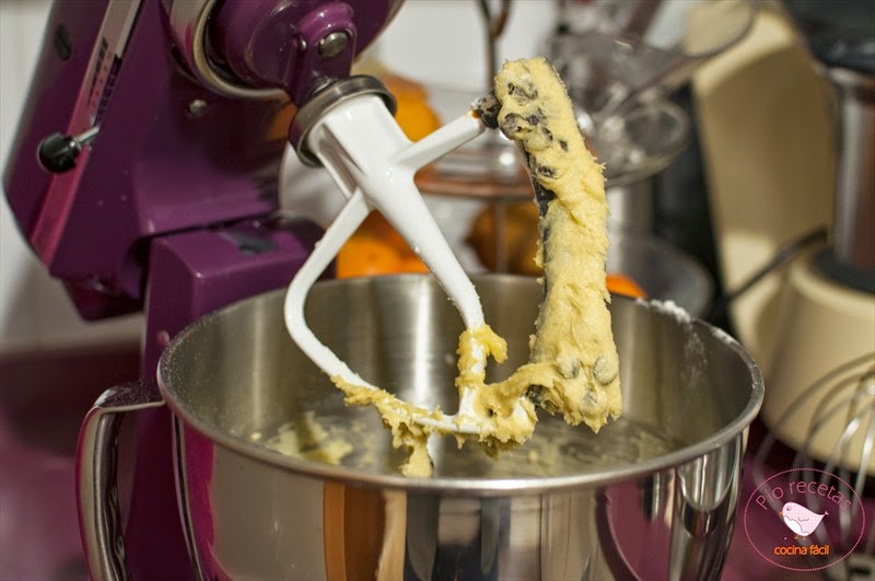 Precalentamos el horno a 180º. Mezclamos la harina con la levadura y la sal y reservamos.Batimos la mantequilla con el azúcar hasta que esté cremoso.Añadimos el huevo y la vainilla seguimos batiendo hasta que se mezcle totalmente.Incorporamos la mezcla de harina y mezclamos.Echamos tambien el chocolate y ya tenemos nuestra masa.