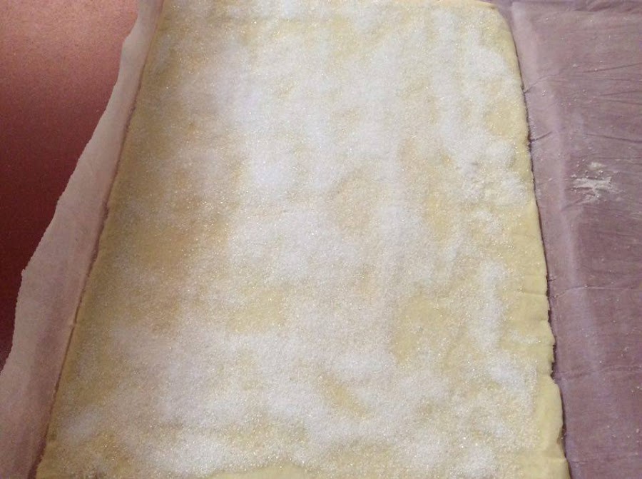 Transcurrido el tiempo, tomar uno de los rectángulos, quitarle el papel de un lado y espolvorear con tres cucharadas de azúcar (en este paso, también puede mezclarse previamente el azúcar con un poco de canela).
