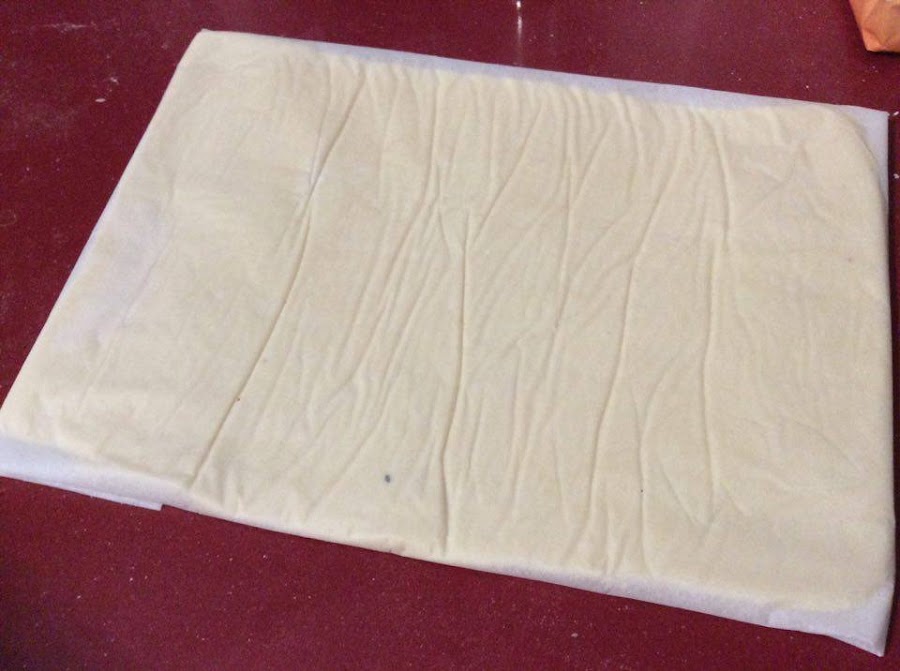Entre dos láminas de papel de hornear colocar uno de los trozos y, con ayuda de un rodillo, formar un rectángulo de 1 cm de grosor.
