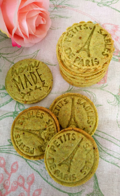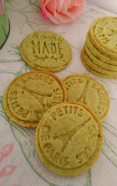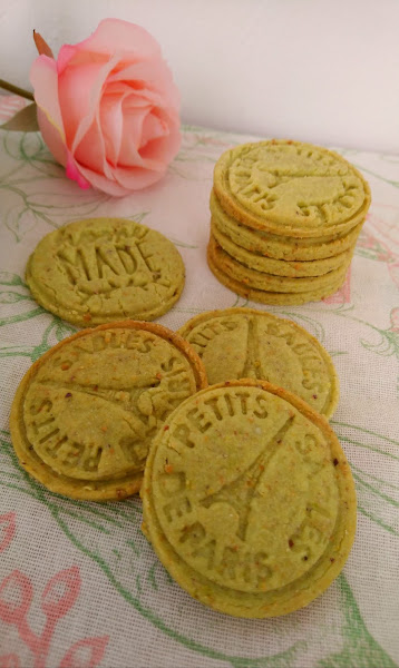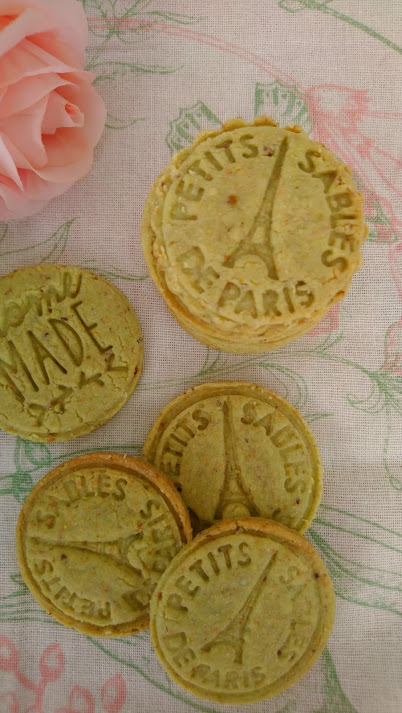 A pesar de las altas temperaturas en cocina, conseguí utilizar los sellos decentemete y os traigo una receta de las más deliciosas que he probado con pistacho. Es una clásica galleta de mantequilla, de las que se deshacen en la boca, pero con un sabor a pistacho en su justa medida que adoraréis si sois fans de este fruto seco.