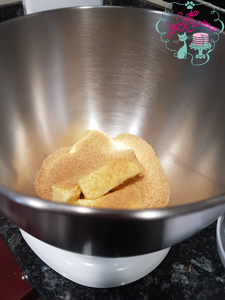 En el bol de la batidora con la pala ponemos la mantequilla que tendremos en pomada junto con el azúcar moreno y batimos aproximadamente durante dos minutos o hasta que estén combinados y cremosos.