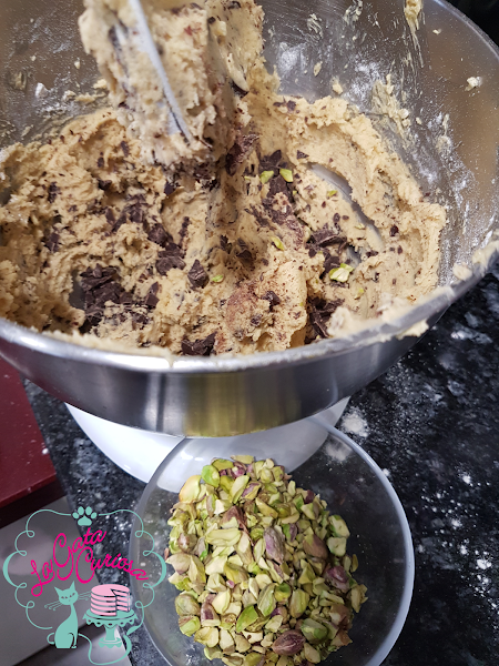 En este punto agregamos una parte del chocolate, dejamos reservado un poco para si al partir las galletas nos quedan huecos podamos añadirle algún trozo, batimos para que se mezcle y hacemos igual con los pistachos reservamos unos poquitos para el rebozado.