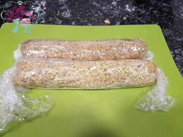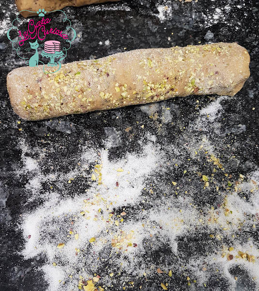 Pasamos la masa a la mesa y la dividimos en dos hacemos un rulo con cada porción de masa y la rebozamos por pistacho picado que hemos reservado y azúcar.