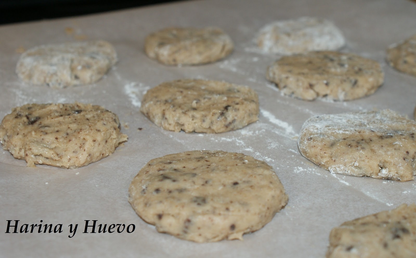 Precalentamos el horno a unos 190º-200ºC. Forramos la bandeja del horno con papel de horno (valga la redundancia). Nos enharinamos un poco las manos y vamos tomando aproximadamente una cucharada de la masa anterior, haciendo bolitas, aplastandolas un poco y colocándolas en la bandeja. Nos enharinamos las manos porque la masa se pega bastante.