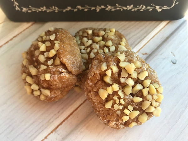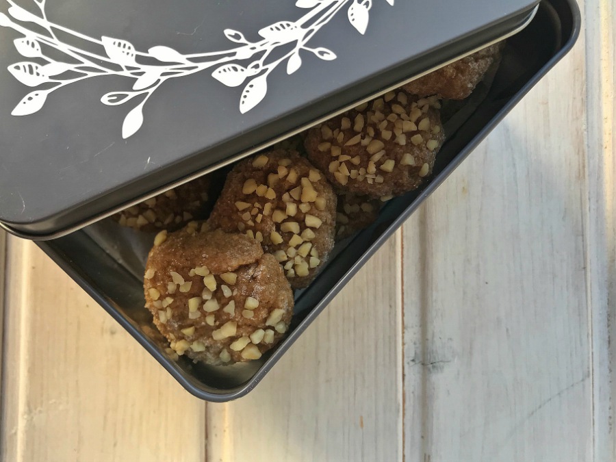 4. Formamos unas bolitas con ayuda de una cucharilla, y las rebozamos en azúcar, para que sea más fácil de manipularlas. Aplastamos estas bolitas ligeramente sobre un platito con almendra picada, de manera que se queda un poquito incrustada en la masa.