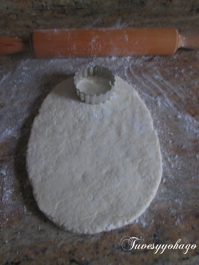 5. Extender la masa con un rodillo con un grosor de 1,5 o 2 cm y cortar círculos de masa con un cortador redondo de 6 cm, pasando el cortador por harina antes de cortar para que se despeguen más fácilmente.