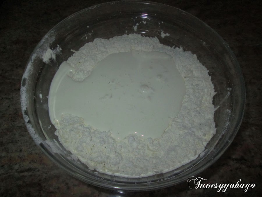 3. Formar un volcán en el centro y verter la nata (crema de leche), mezclando suavemente con el tenedor hasta que se forme una masa (notaréis que se pega a los dedos).