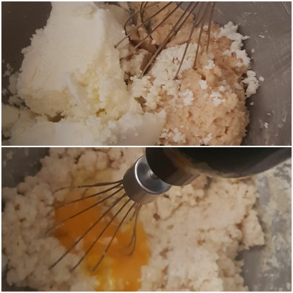 Mezclar el queso y el huevo Una vez conseguida una mezcla suave de la mantequilla, le añadimos el huevo y el queso mascarpone, y batimos con ayuda de unas varillas eléctricas si las tenemos, si no, con varillas manuales hasta que quede todo bien integrado.( Si veis que os salen grumos, no pasa nada, eso pasa porque alguno de los ingredientes estaba a diferente temperatura, a mí me pasó, luego cunado se le añada la harina se soluciona.)