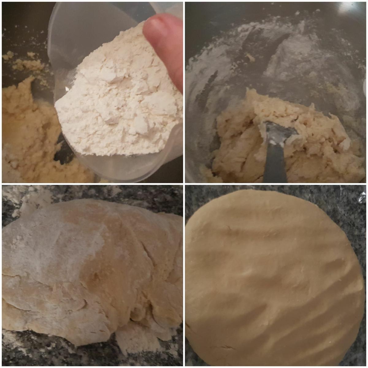 Añadir la harina Ahora le añadimos la harina y la pizca de sal, echarle unos 400 gr de harina y si veis que admite más le echáis el resto. Cuando os cueste mezclarla en el bol, la pasáis a la encimera y termináis de amasar. Tiene que quedar blandita, pero que no se os peque en las manos. Envolvemos en papel film metemos en el congelador unos 15 minutos o 40 minutos en la nevera, para que se endurezca la mantequilla y sea más manejable para hacer las galletas.