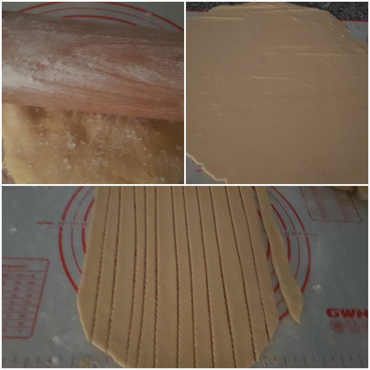 Cortar la masa Pasado el tiempo en la nevera, ponemos el horno a precalentar a 180ºC, y vamos a empezar ha hacer galletas. Amasamos la masa en forma rectangular y cortamos en tiras largas, yo lo hice con un cortapizzas, pero os sirve un cuchillo, no pasa nada si sobra masa, por que haremos este proceso todas las veces necesarias hasta terminar con la masa.