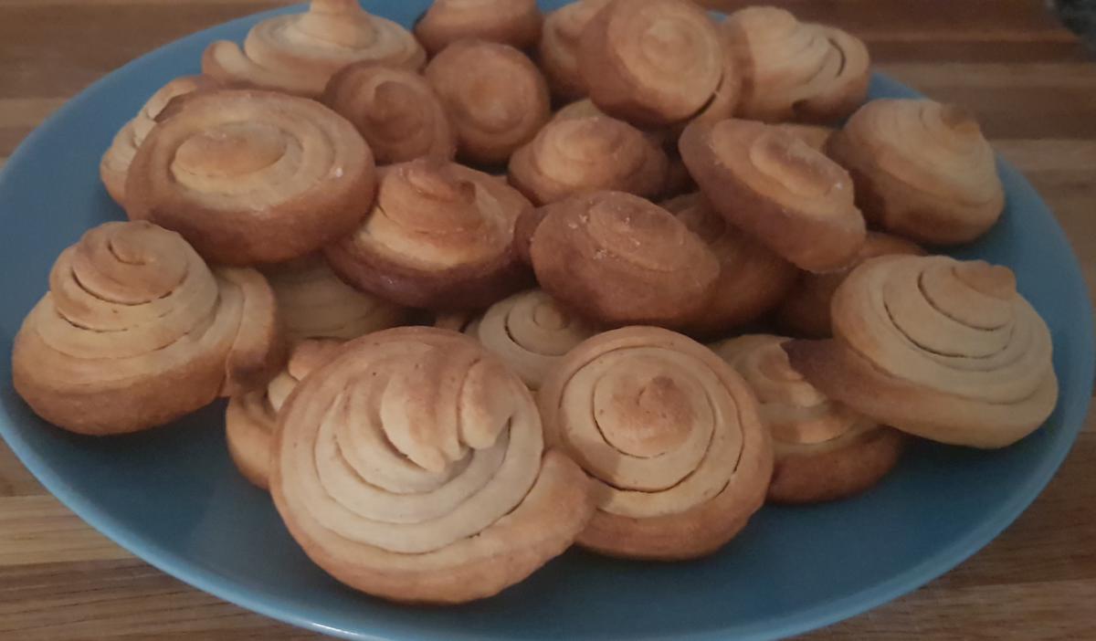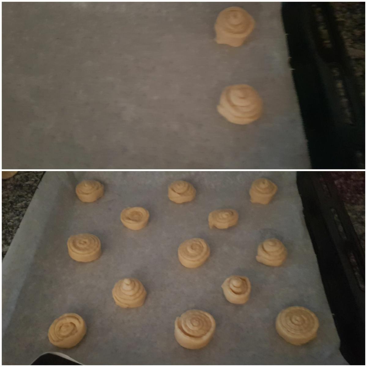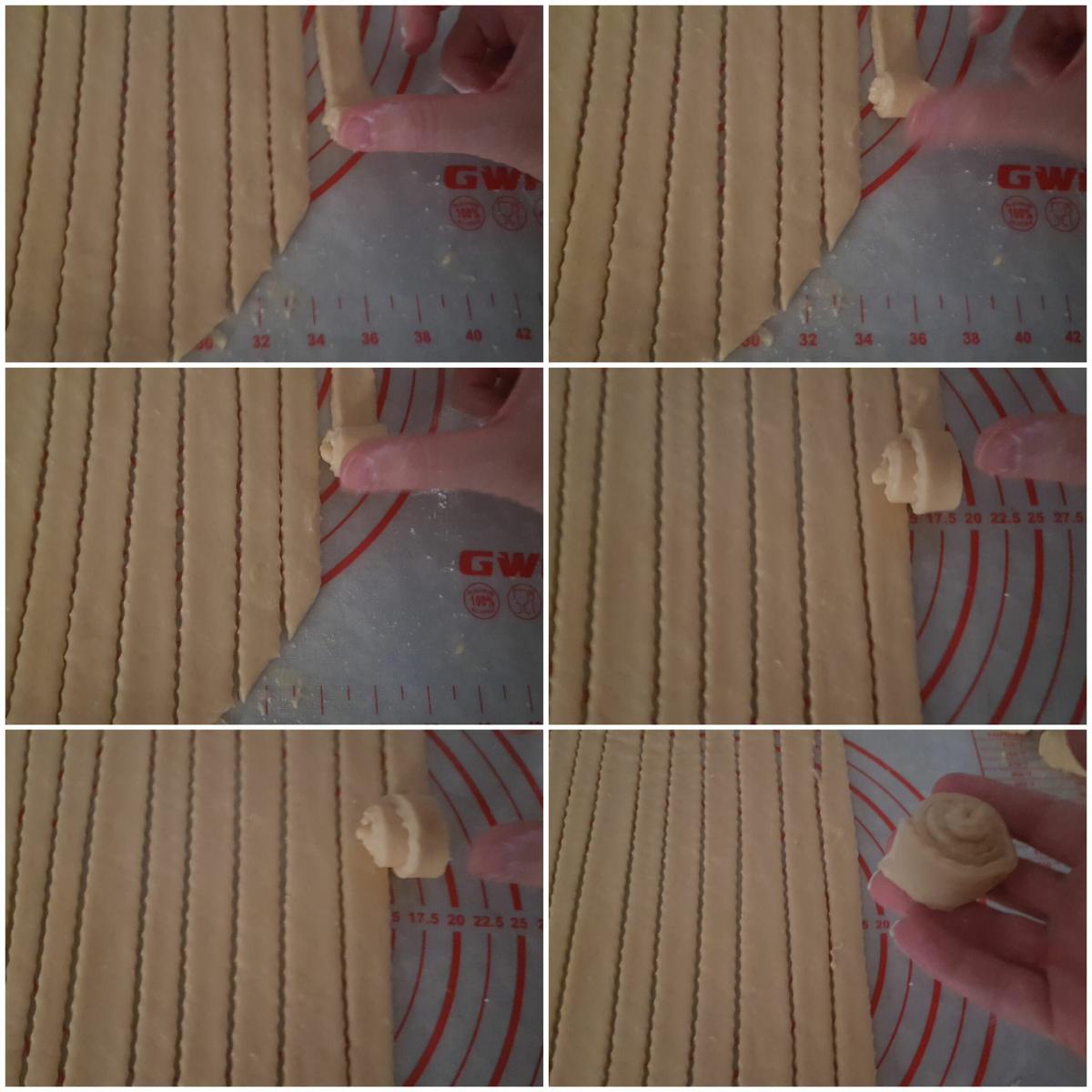 Enrollar las tiras Ahora es muy sencillo, empezamos desde un extremo y enrollamos entre si, formando un caracol, y vamos dejándolas sobre la bandeja del horno. Estamos en Julio y hace mucha calor, por lo que os sugiero que la masa que no estéis trabajando con ella la metáis en la nevera mientras tanto, para que la mantequilla no pierda dureza y no se nos complique el enrollado.