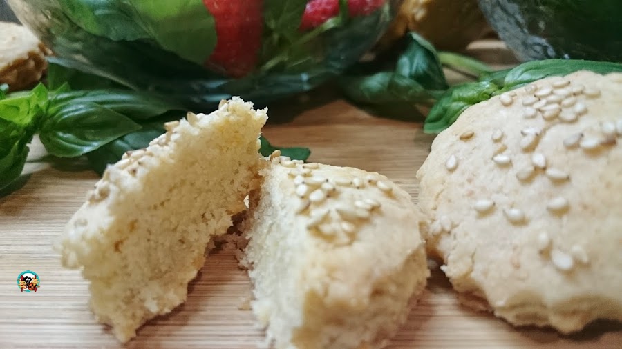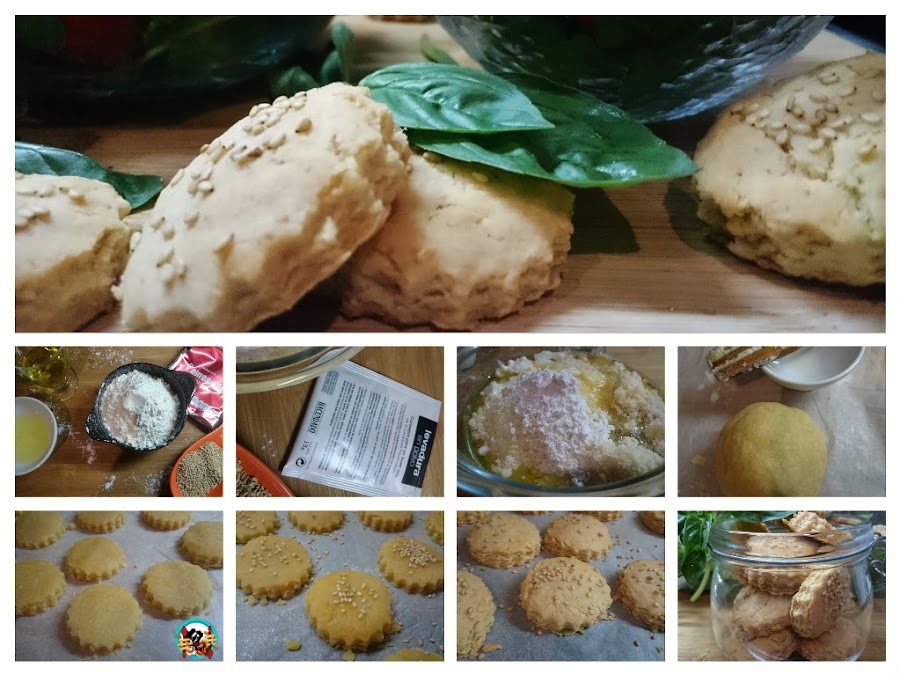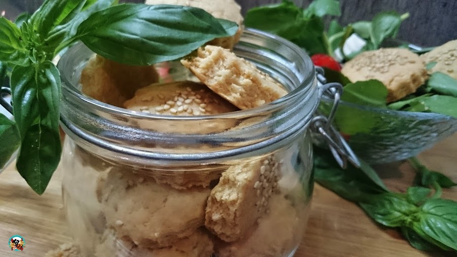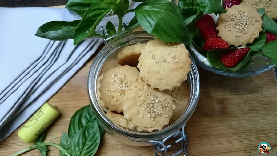 2.- Precalentamos el horno a 180ºC. Estiramos la masa con la ayuda de un rodillo sobre una superficie cubierta de harina o papel de horno. Cortamos la galletas con un molde de galleta o un vaso pequeño. Esparcimos sobre cada galleta un poco de semillas de sésamo y horneamos 10 o 15 minutos sin que lleguen a dorarse. Las dejamos enfriar sobre una rejilla y las servimos como acompañamiento de alguna ensalada o como aperitivo, con algo de jamón serrano, algunas aceitunas y una buen copa de vino.