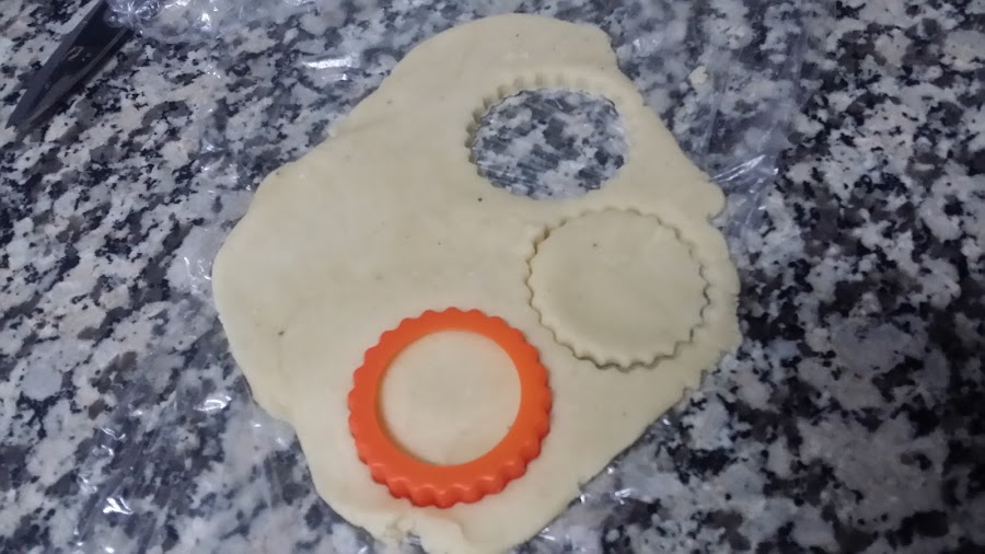Una vez amasado extendemos la masa en la mesa, como de 1 cm de grosor, y cortamos con un molde. Yo he usado un molde de galleta circular.