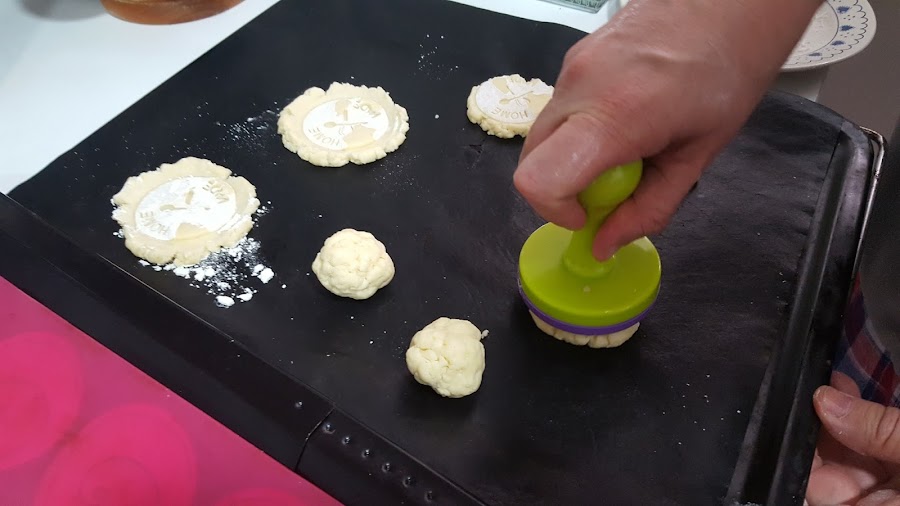 5.- Vaciamos la masa sobre un plato y vamos formando bolitas de unos tres centímetros, más o menos. Colocamos las bolitas y las vamos aplanando. En mi caso, las aplanamos con el tampón para sellos de galletas, pero podéis hacerlo con un vaso.
