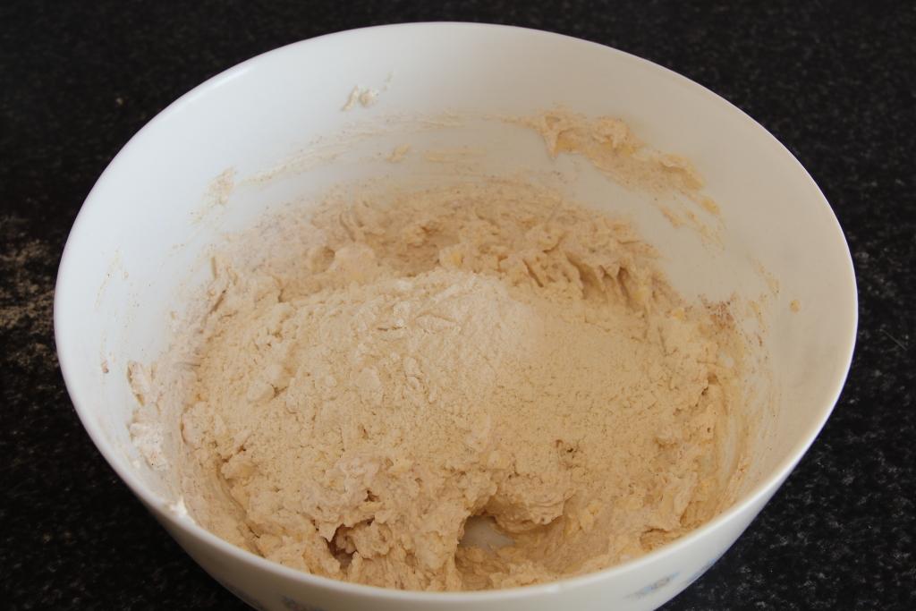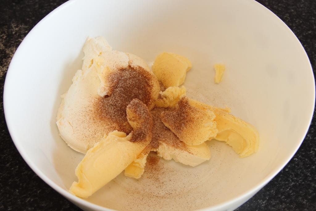 En un bol amplio echamos la mantequilla, el queso y el azúcar con la canela (los 10 gr). Mezclamos bien que quede todo integrado. Incorporamos la harina tamizada, poco a poco. Seguimos mezclando.
