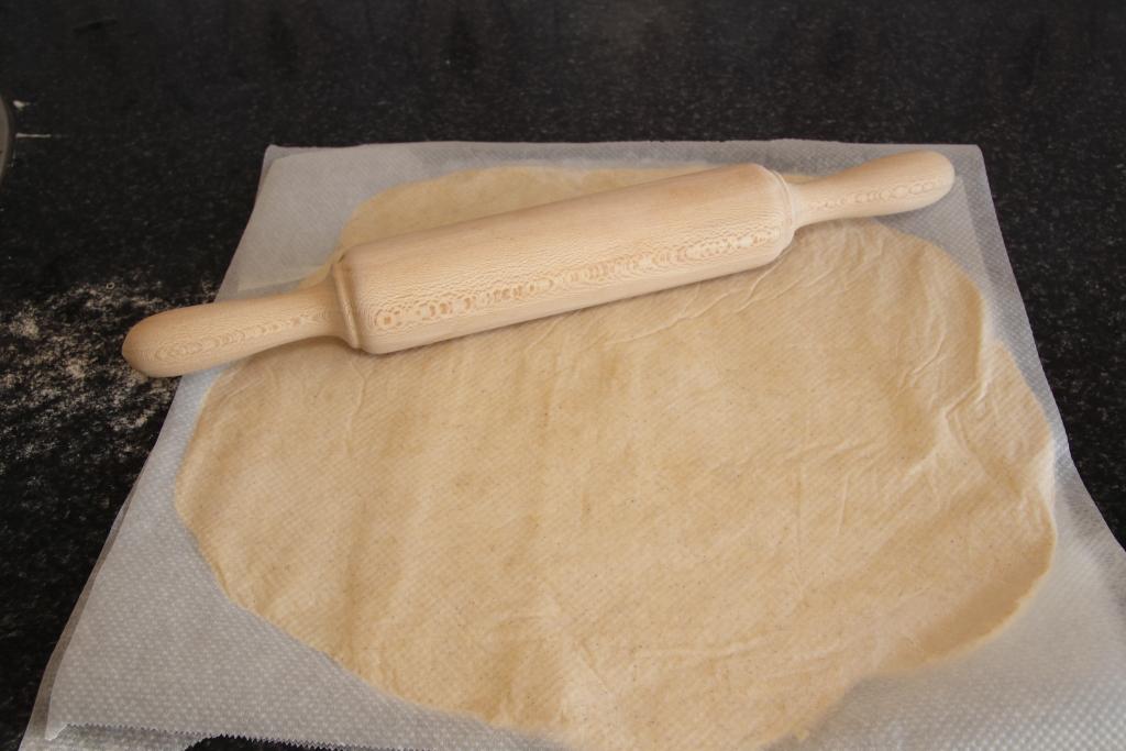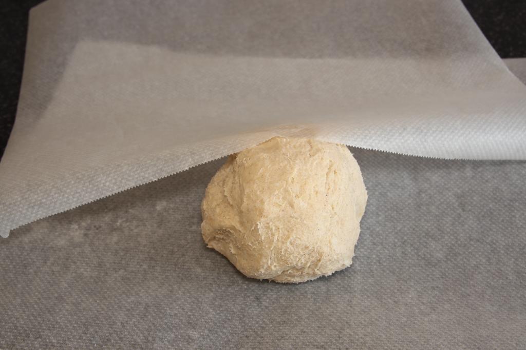 Cortamos dos trozos de papel de horno rectangulares, en uno de ellos colocamos la masa en una bola, tapamos con el otro, aplastamos un poco la masa con las manos y seguimos con el rodillo, estirando la masa en forma de rectángulo de unos 2-3 mm de grosor.