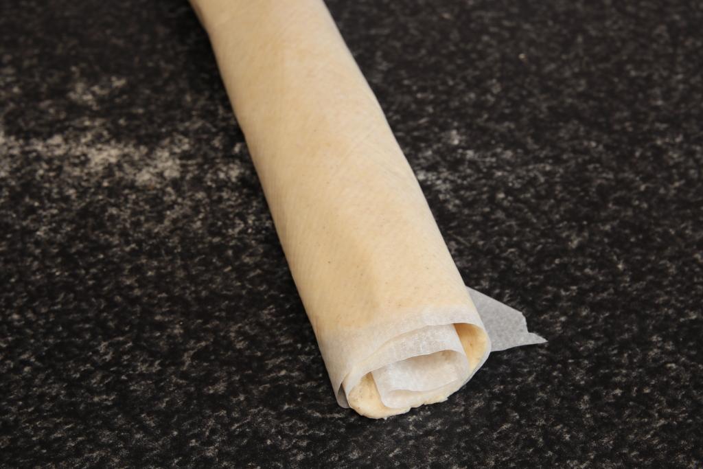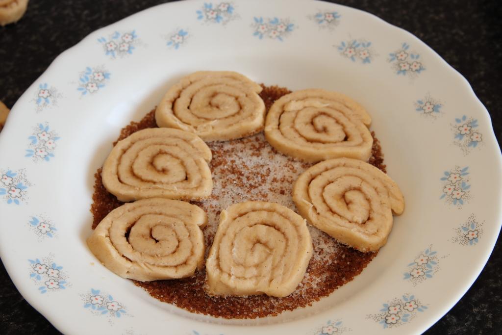Sacamos el rulo del frigorífico, retiramos el papel, costará un poco y volvemos a enrollar la masa. Cortamos rodajas de unos 2-3 mm de grosor, vamos rebozando las galletas en la mezcla de azúcar moreno y blanco (si vemos que es poco echamos más). Disponemos las galletas en la bandeja de horno, uno poco separadas porque crecerán en el horno. Horneamos hasta que veamos que comienzan a tostarse, sin que lo hagan del todo.