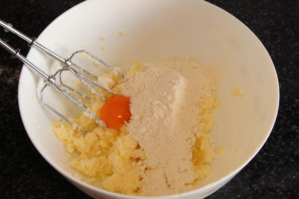 En un bol amplio batimos con las varillas eléctricas el queso con la mantequilla hasta conseguir una crema suave. Añadimos el azúcar poco a poco, seguimos batiendo e incorporamos el huevo, la sal, la levadura y la harina. Batimos hasta que todo quede bien integrado.