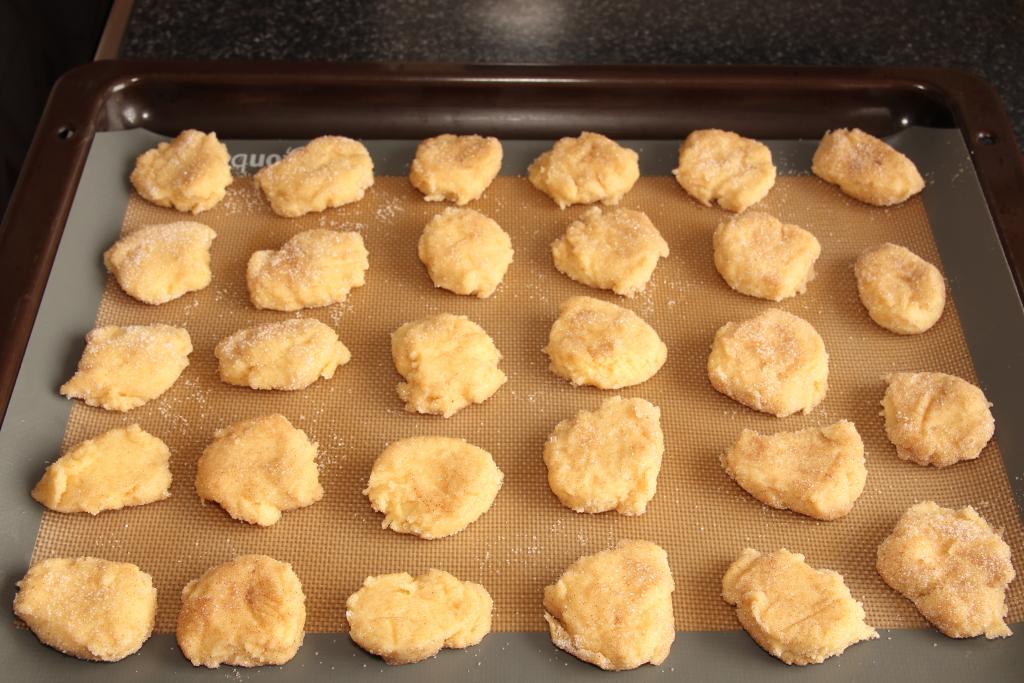 Quedará una masa muy pegajosa. Hacemos pequeñas bolitas con la masa (igual nos tenemos que ayudar con un par de cucharas), las pasamos por la mezcla de azúcar y canela por ambas caras y aplastamos un poco. Las disponemos en la bandeja de horno forrada y horneamos unos 8-9 minutos, deben quedar crujienes por fuera y blanditas por dentro. Sacamos y dejamos enfriar sobre una rejilla.