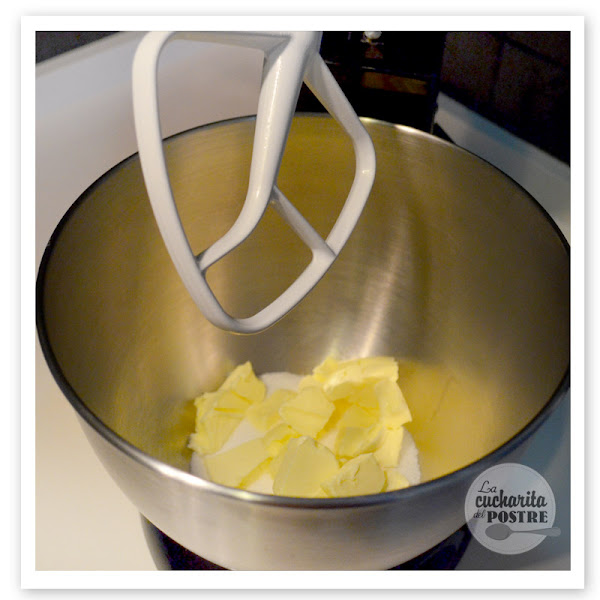 1. Mezcla la mantequilla fría cortada en cubitos con el azúcar hasta tener una masa cremosa y de color pálido.