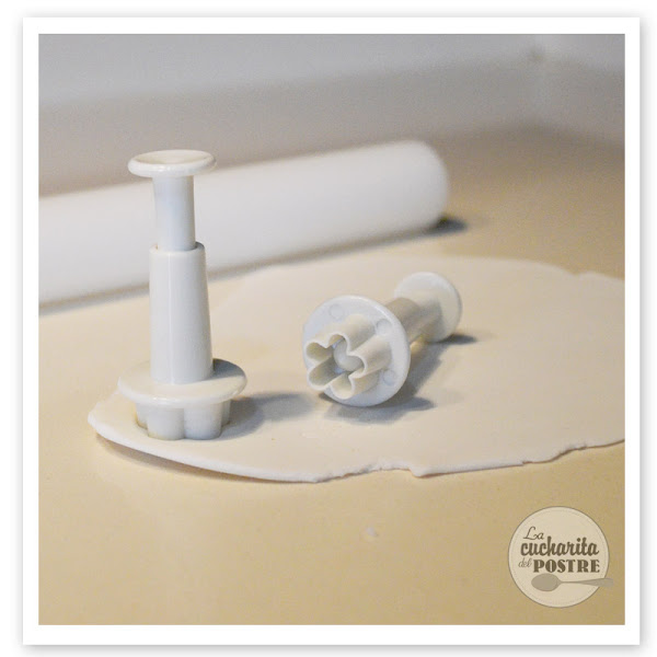 1. El día anterior prepara unas florecitas de fondant: amásalo y estíralo bien con un rodillo especial para fondant hasta que tenga un grosor de 1-2 milímetros. Cuanto más fino quede, menos empalagoso será. Con un cortador con expulsor en forma de flor pequeñita, ve haciendo las flores y déjalas en un formador de flores para que no se deformen. Nosotros hemos usado flores de dos tamaños distintos.