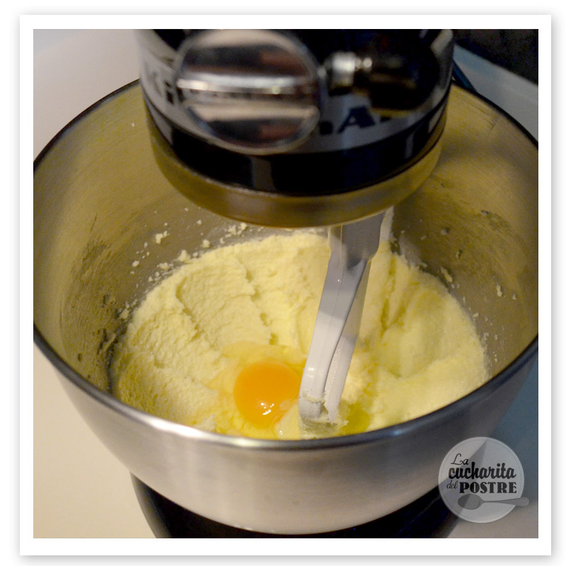 2. Añade el huevo y bátelo hasta que se integre con la mantequilla. Si es necesario, remuévelo con una lengua repostera rebañando bien las paredes del bol para que no queden restos sin mezclar.