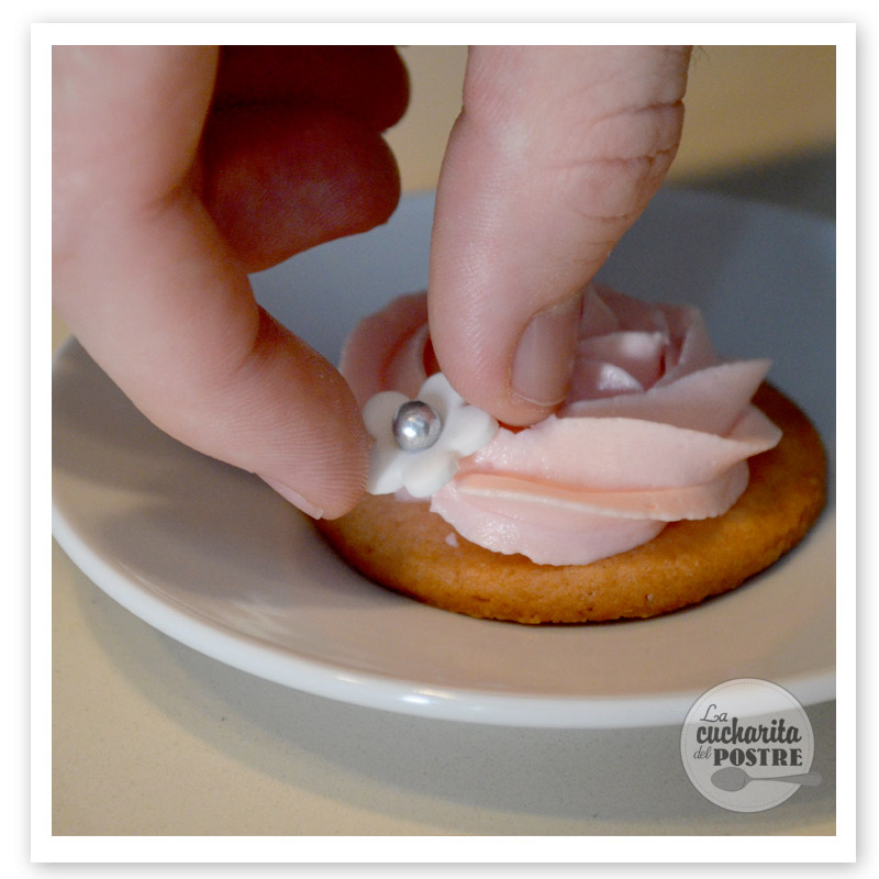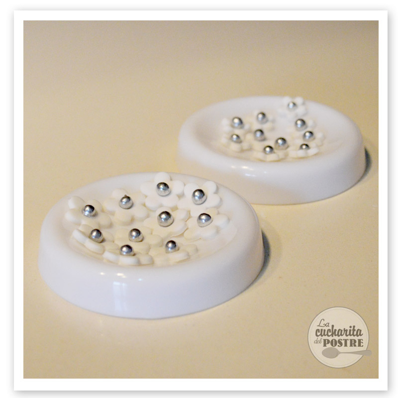 2. Pon un poquito de pegamento comestible en el centro de la flor y pega ahí una perlita plateada. Déjalas secar de un día para otro para que el fondant se endurezca.