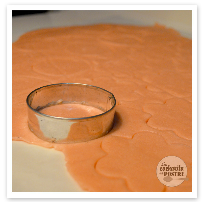 8. Transcurrido ese tiempo, estira bien la masa entre dos papeles de horno usando un rodillo consiguiendo un groso de 3-4 milímetros y vuelve a refrigerar otra media hora. Después utiliza tu cortador preferido para darle forma a las galletas. Nosotros hemos usado un cortador redondo y otro en forma de flor.