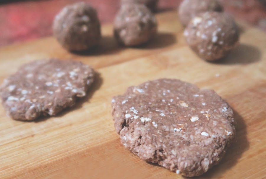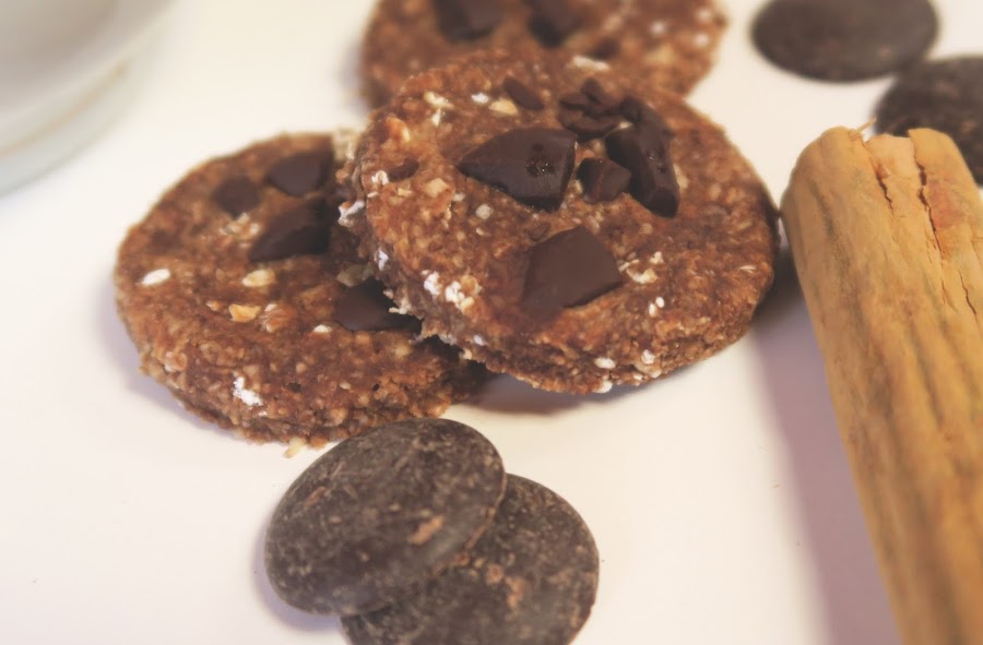 Decorar las galletas con el chocolate y llevar al horno precalentado, a 100º por aprox. 15 minutos. Con papel mantequilla, idealmente. Yo no tenía así que puse un poquito de aceite de coco para que no se pegara la masa.