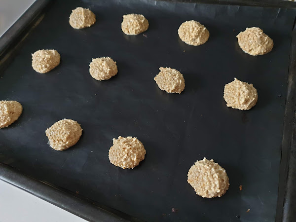 4. - Con un par de cucharas, o con un sacabolas pequeño, en la bandeja de horno forrada con papel de hornear, vamos colocando pequeñas porciones separadas unas de otras, que luego crecen.
