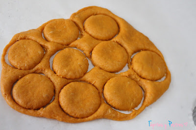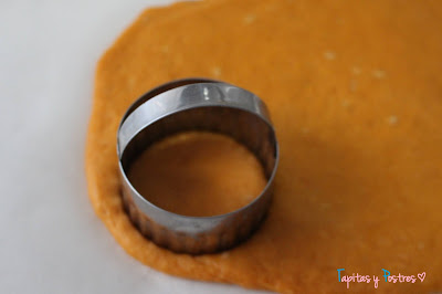 Pasado el tiempo, amasamos y estiramos dejando un grosor de unos 3 mm. Cortamos círculos con un cortapasta o un vaso pequeño.