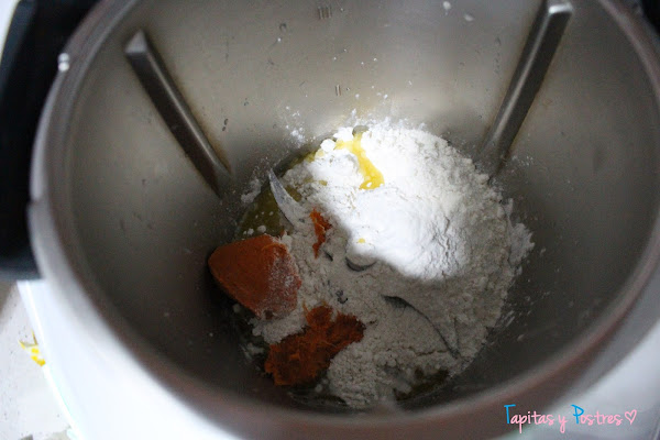 Yo he preparado las galletas con thermomix. Calentamos el agua con la levadura, durante dos minutos, a 37º y velocidad 2. Sin thermomix, templaremos el agua con la levadura y disolvemos.