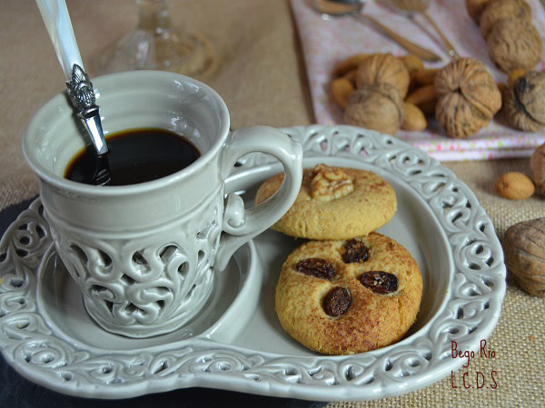 Las vamos pasando a una bandeja de horno a la que le habremos puesto papel de hornear . Las espolvoreamos con el azúcar, la canela a gusto tamizada a través de un colador y colocamos media nuez en unas y pasas en otras .