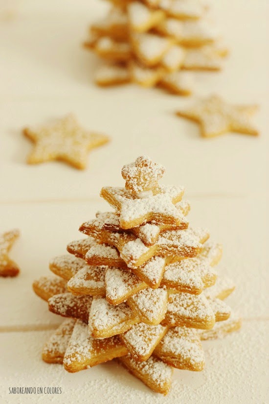 7. Para hacer los arbolitos, empezar por la base con las estrellas más grandes, colocando 2 de cada tamaño hasta que se hayan puesto todos los tamaños (10 estrellas en total). Para pegar las estrellas, colocar unas gotas de glasa, cuya receta podréis ver en este post.