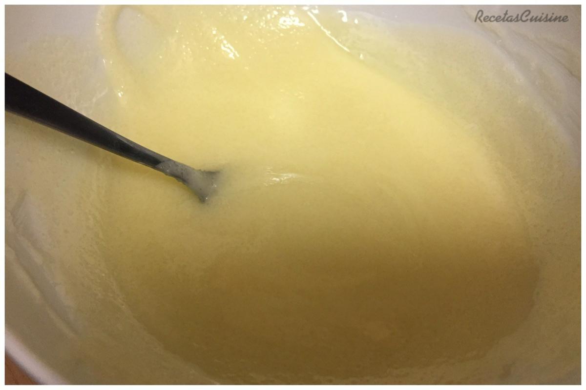 2. En un bol, ponemos la mantequilla y la metemos unos segundos en el microondas, batimos con un tenedor, para que nos quede en pomada (semi derretida). Añadimos el azúcar y seguimos batiendo hasta que nos quede todo como una crema y lo añadimos al bol.
