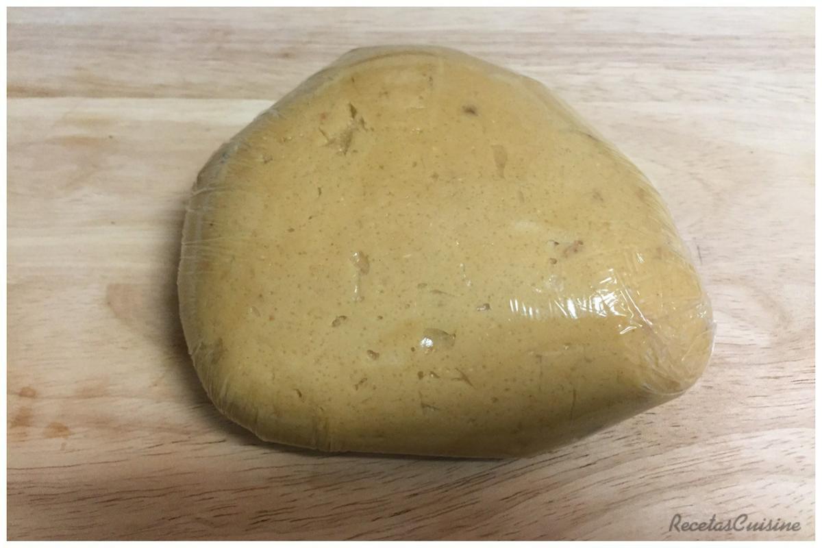 4. Sacamos del bol, formamos una bola que aplanaremos un poco, y envolvemos en papel film. Guardamos en la nevera durante un par de horas, o en el congelador si queremos ir más deprisa, 15-20 minutos máximo. (Yo lo dejé en la nevera).
