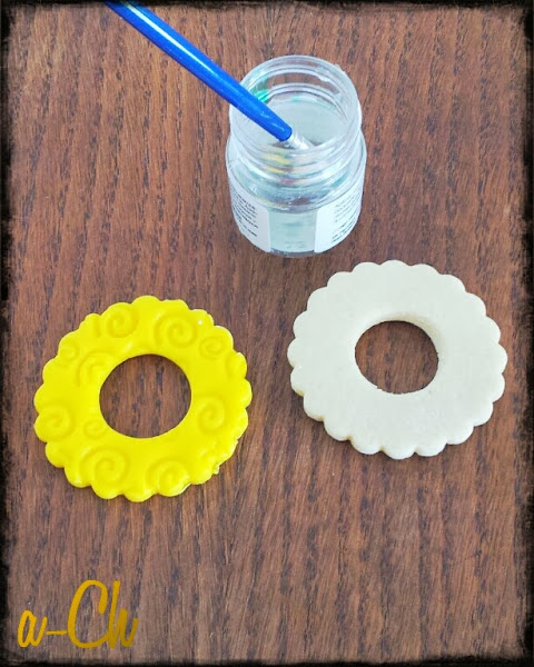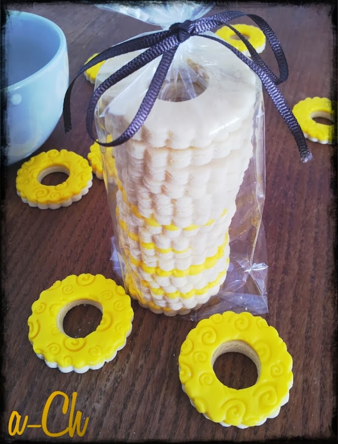 Mezclamos el azúcar glass con la mantequilla (yo lo hice con cuchara de madera), hasta obtener una textura cremosa. Añadimos la yema de huevo y mezclamos bien. Tamizamos la harina, el sobre de pudín de vainilla y la pizca de sal, se lo añadimos todo a la mezcla anterior hasta obtener una masa homogénea (en mi caso, mezclo en este paso con las manos hasta hacer una bola. Hacemos una bola, la envolvemos en papel film y a la nevera. Mientras precalentamos el horno 160ºC calor arriba y abajo. Sacamos la masa de la nevera, la estiramos con un rodillo sobre papel film, que no queden muy gorditas. Las vamos dejando en la bandeja del horno y las metemos unos 10-12 minutos, que no se doren (en mi horno, 10 minutos y quedaron muy ricas y blanquitas). Dejamos enfriar sobre una rejilla. Para decorarlas, estiramos el fondant con un rodillo, que no quede muy gordito, después, pasamos el rodillo texturizador por encima (si no tienes, puedes utilizar cualquier objeto que encuentres por casa que tenga un relieve chulo y pasarlo por encima), y con el cortador de galletas vamos cortando la misma forma de nuestras galletas, con la boquilla hacemos el agujero de enmedio y lo pegaremos a la galleta con un poco de miel o agua, a modo de pegamento (yo utilizé pegamento comestible). Presionamos levemente y dejamos secar. Las podéis consumir inmediatamente o guardar en una lata de galletas.