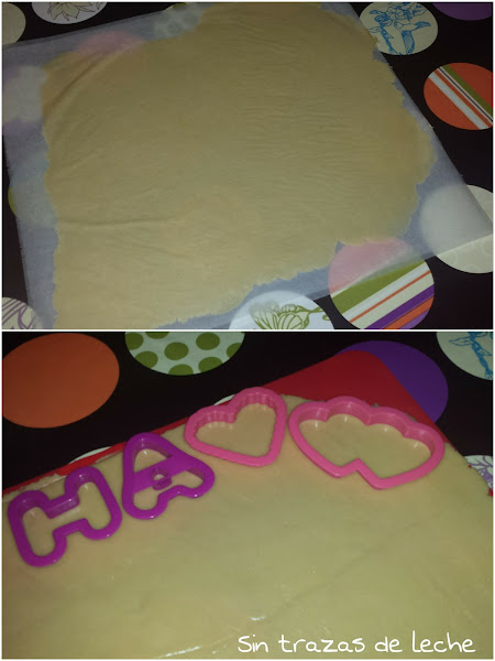 Ahora necesitamos papel vegatal ponemos una de las bolas encima y otra de papel,aplastamos con un rodillo hasta dejarlo todo igualado y plano, hacemos lo mismo con la otra bola, las ponemos en una bandeja y metemos en la nevera más o menos 1 hora.
