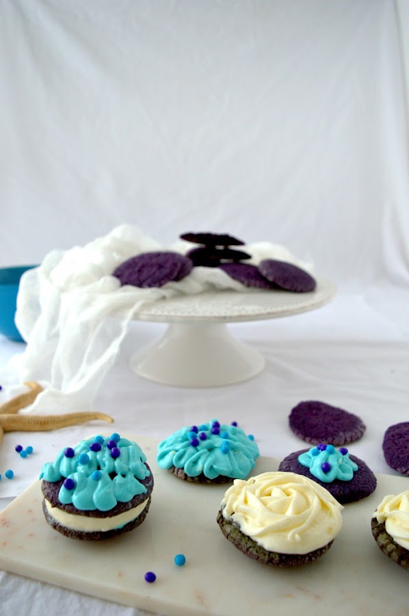 I split the cream into two and one of them I colored in blue. Make some decorations on top of half of the cookies, fill them with the white cream and make cookie sandwiches.