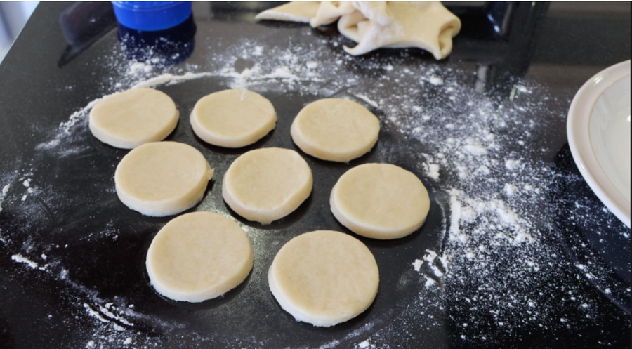 2. Agregue el polvo de hornear y la harina. Amasar la masa. Estirar la masa de 5 mm de grosor. Cortar en forma redonda (tengo 6 cm)