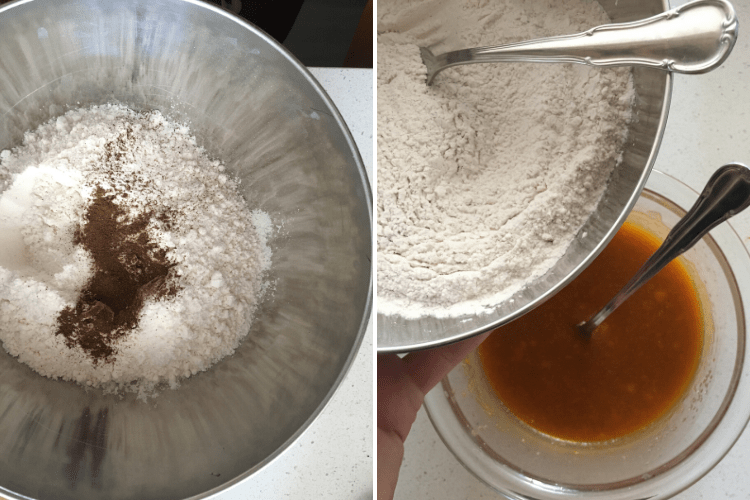 En otro recipiente tipo bol, agregar todos los ingredientes secos (harina, polvos de hornear, sal y canela) y mezclar bien.