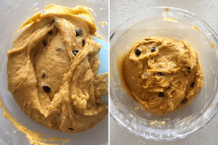 Agregar los chips de chocolate (dejar un poco aparte) y volver a mezclar bien. Cubrir el recipiente y dejar en el refrigerador al menos media hora (puedes dejarla también de un día para otro).