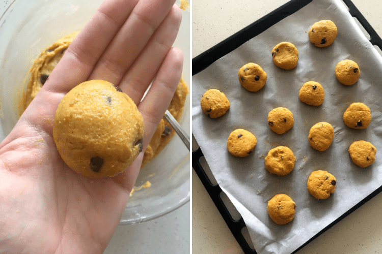 Formar bolitas e ir colocándolas en una bandeja de horno (con papel de horno o similar para que no se peguen). Puedes aplastarlas un poco con la parte de atrás de una cuchara. Hornear con el horno precalentado a 180 grados durante 12 a 15 min o hasta que estén ligeramente cocidas (recuerda que deben quedar suaves no crujientes).