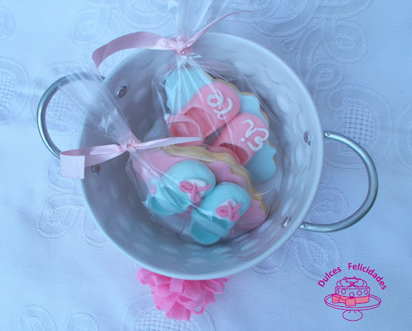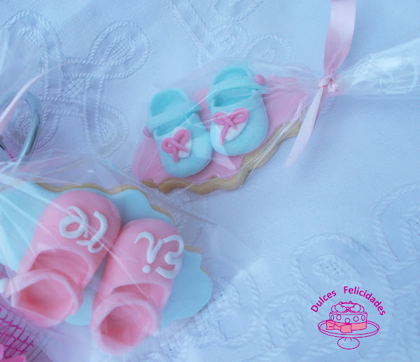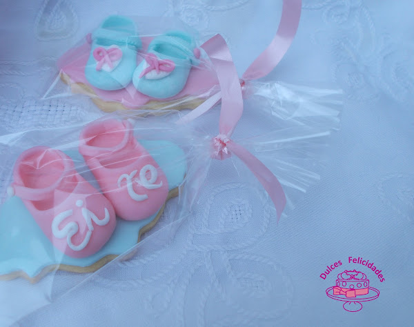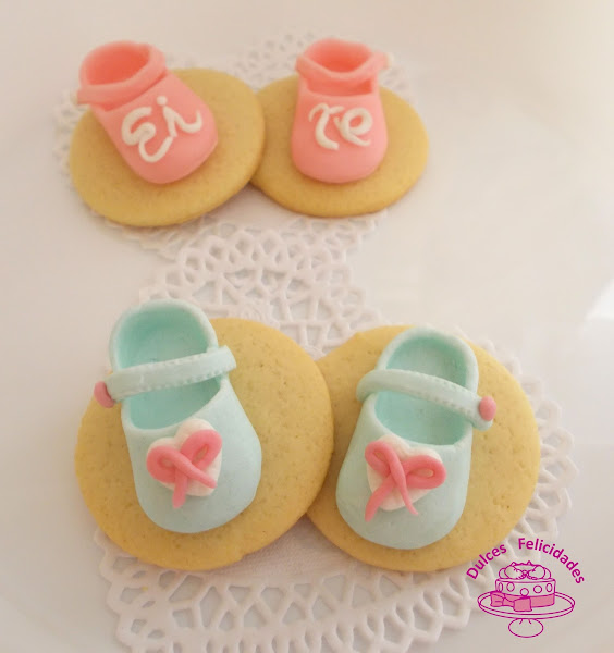 Preparé los zapatitos de fondant en tonos rosas y azules, y los coloqué sobre las galletas de mantequilla tal y cómo se puede ver en la siguiente foto.