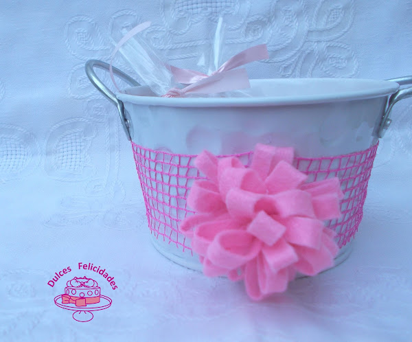 Para que Kike las llevase, utilicé una macetita, que decoré con red rosa y una flor de fieltro que también hice yo misma (es super-sencillo).