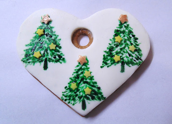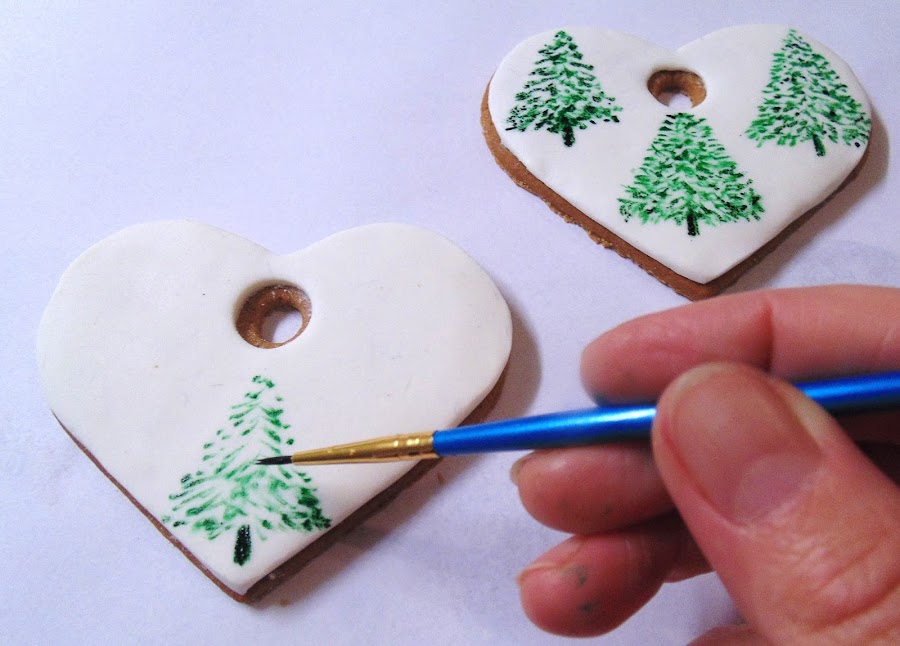 Con un pincel muy fino y colorante verde diluido en un poco de alcohol hacemos pequeñas pinceladas para imitar las hojas de un árbol. Podemos usar diferentes tonos para darle más realismo. Enganchamos estrellitas y bolitas brillantes de azúcar para simular la decoración del árbol. Terminamos con pequeñas motitas de colorante azul.