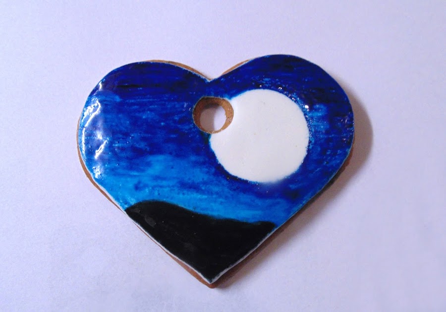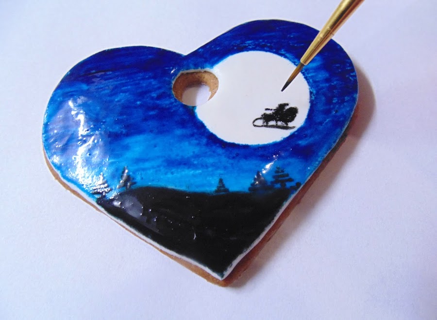 Es el más complicado, porque tenemos que hacer un degradado del azul con un poquito de negro para que parezca un cielo nocturno, y esto sin pintar un círculo blanco que hará las veces de la luna (es más fácil si ponemos sobre la galleta un trocito de papel redondo del tamaño de la luna, pintamos y luego lo retiramos). Finalmente con un pincel muy fino y mucha paciencia hacemos la silueta de los árboles y del trineo con Papá Noel.